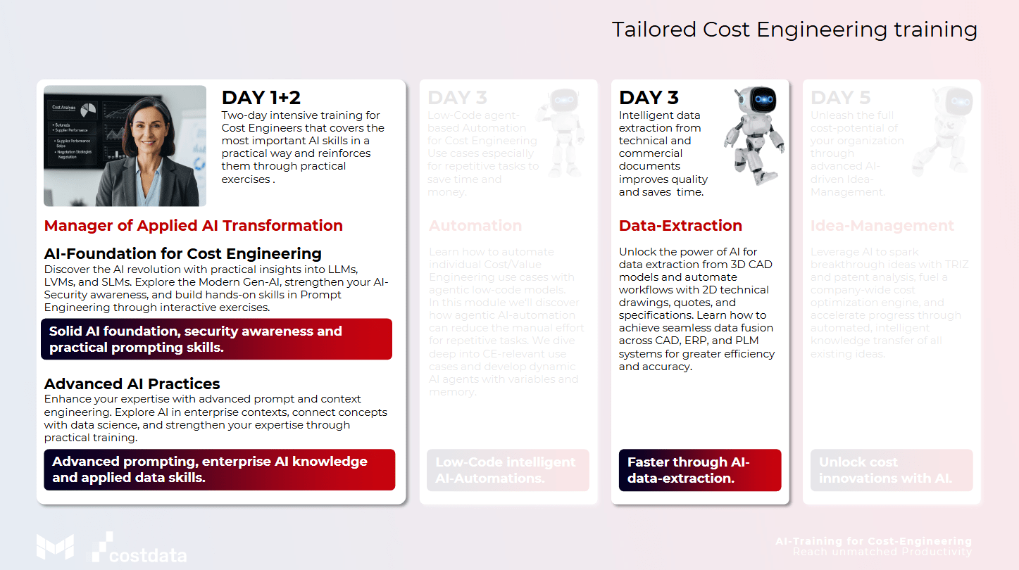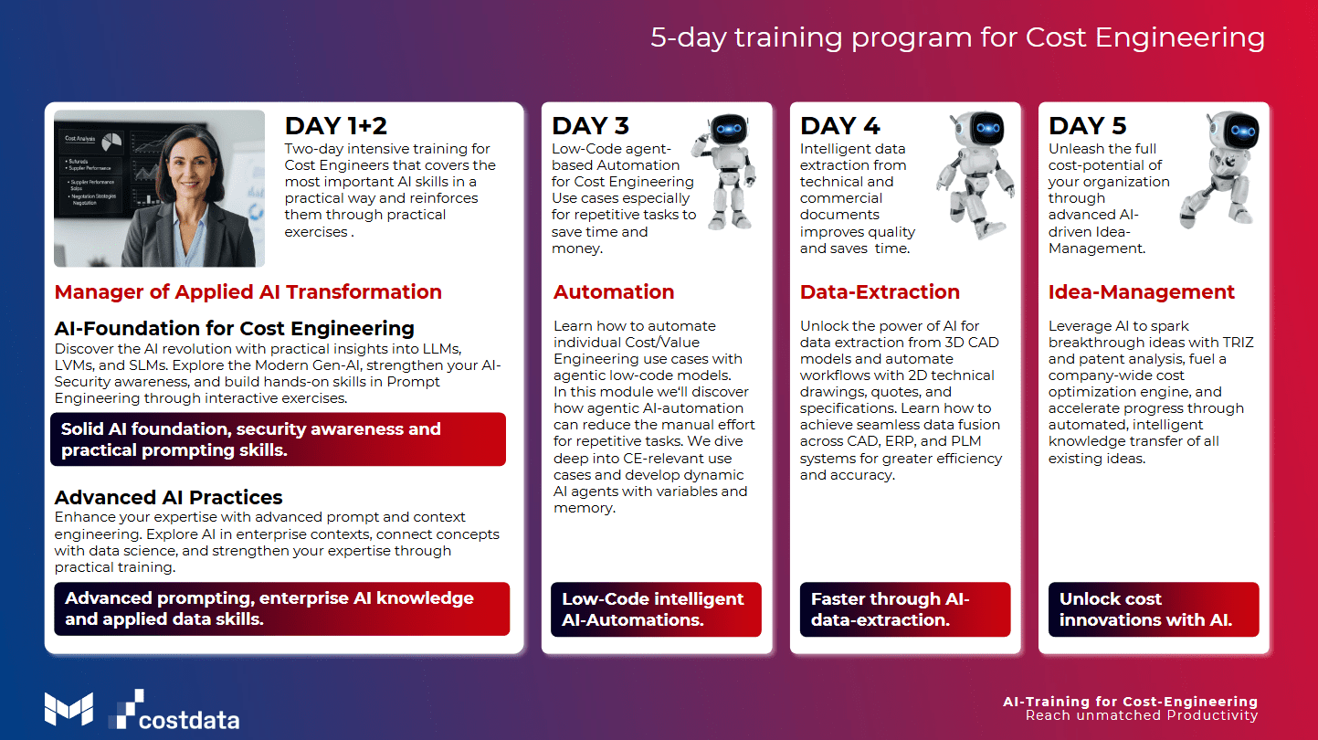 Comment l'IA change-t-elle l'ingénierie des coûts ? Dans notre atelier pratique, vous apprendrez comment les méthodes basées sur l'IA révolutionnent l'analyse des coûts et l'optimisation de la valeur. Utilisez les technologies les plus récentes pour prendre des décisions fondées, augmenter l'efficacité et garantir un avantage concurrentiel.