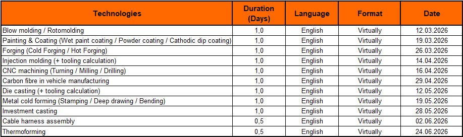 I nostri workshop tecnologici per ingegneri dei costi offrono un'opportunità unica per imparare e approfondire il calcolo dei costi dei prodotti realizzati con diverse tecnologie di produzione. Che si tratti di stampaggio a iniezione, stampaggio, processi di rivestimento, lavorazione CNC o molte altre tecnologie, abbiamo il workshop giusto per voi. Come partecipanti, acquisirete una conoscenza approfondita della struttura dei costi e del calcolo delle varie tecnologie di produzione. Apprenderete approcci pratici per determinare con precisione i costi dei prodotti e migliorerete la vostra capacità di identificare e realizzare risparmi sui costi.