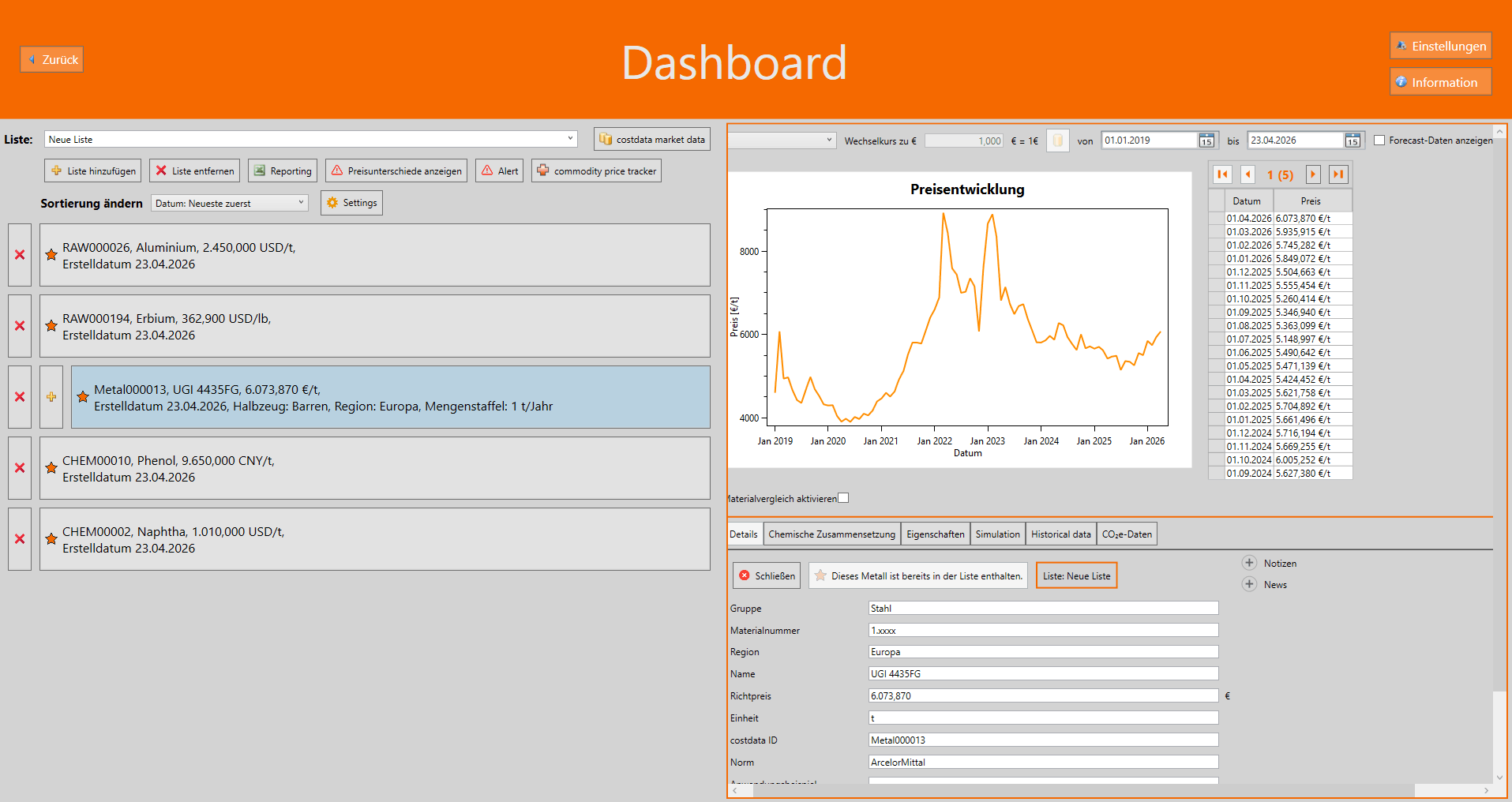 Das „costdata® dashboard“ ist ein Tool zur Kontrolle und Analyse verschiedener Kostenfaktoren. Mithilfe des Dashboards können Sie sich den individuellen Preisverlauf der Kostenfaktoren anzeigen lassen und diese miteinander vergleichen und diese in eigens erstellten Listen gegenüberstellen. Hierfür stehen sämtliche Datensätze der „costdata® market data“ zur Verfügung.
