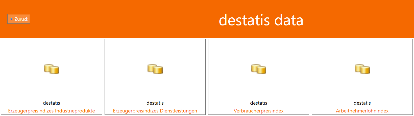 Nachdem eine der verfügbaren Datenbanken ausgewählt wurde, können aus unterschiedlichen Unterkategorien die zu untersuchenden Indizes ausgewählt werden. Durch Klicken auf die entsprechende Kategorie kann man sich den Preisänderungsverlauf in Form eines Graphen oder tabellarisch anzeigen lassen.